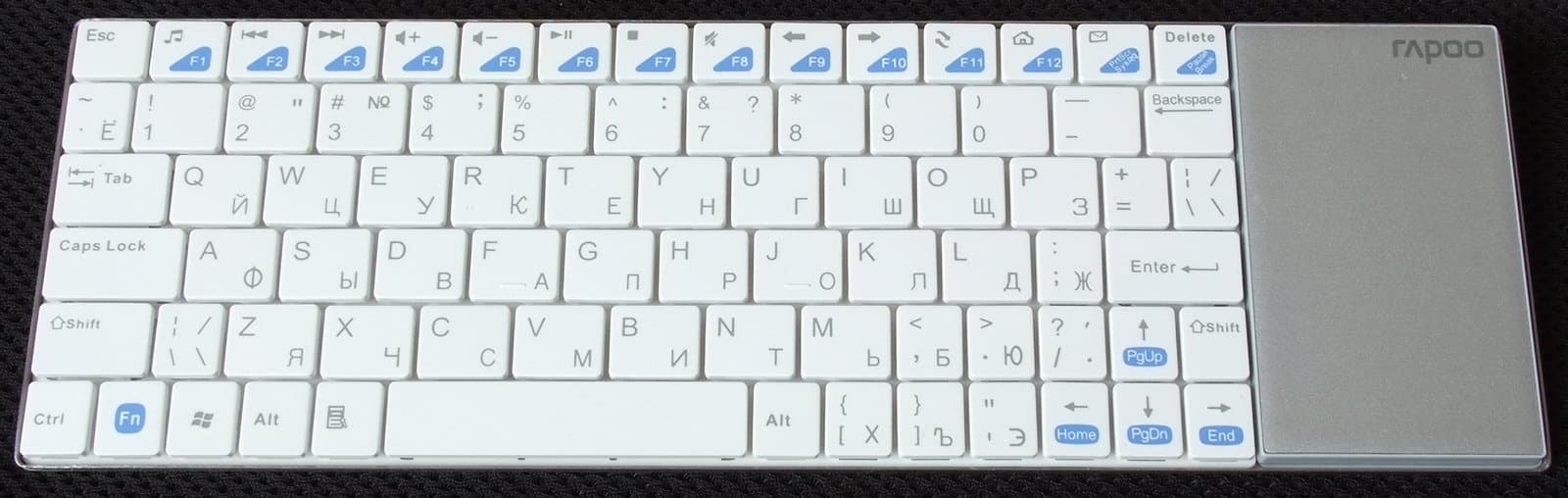 Миниатюрные габариты не могли не сказаться на раскладке. Разработчики старались обойтись без жертв и разрушений, сохранив основную часть раскладки, однако в результате кнопка «+ / =» переехала в ряд ниже на место кнопок «[ / x», «] / ъ» и «' / э», а те, в свою очередь, эмигрировали еще дальше вниз, расположившись справа от пробела между кнопкой «Alt» и стрелочным блоком. При такой экономии пространства странновато выглядит дублирование «слэш»-кнопки в верхней правой и нижней левой частях клавиатуры, но в определенных ситуациях это может быть удобно. К положительным моментам можно отнести сохранение обеих кнопок «Shift» (левая — длинная, правая — короткая) и длинный «Enter».