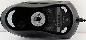 На брюшке, ровно по центру — сенсор, три лапки из белого тефлона — две поменьше впереди и одна широкая сзади. Также наклейка со служебной информацией и — внимание!!! — кнопка переключения профилей. Индикация текущего профиля не предусмотрена. Только в момент переключения подсветка мигает немного по-разному для каждого профиля: для первого один раз, для пятого — пять и т.д. Полное переключение профилей по кругу занимает около 15 секунд.