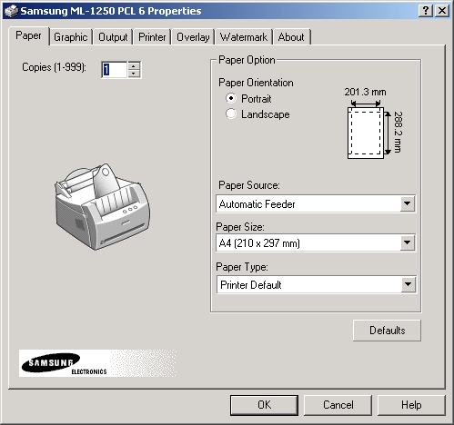Меню настроек печати принтера очень обширно. Закладка "Бумага" (Paper) позволяет задать без участия приложения количество выводимых копий (до 999), ориентацию бумаги, ее размер, ручную или автоматическую подачу.