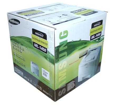 Коробка принтера Samsung ML-1450 выполнена в современном симпатичном стиле и схожа по дизайну с упаковками других новых моделей принтеров компании.
