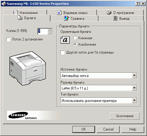 Меню настроек печати принтера состоит из шести закладок, описывающих всевозможные потребности в дополнительных настройках. Так, закладка "Бумага" (Paper) помогает задать количество выводимых на печать копий (от 1 до 999), ориентацию бумаги, ее размер и тип; при наличии дополнительного лотка появляется возможность подключить его в этом же меню, а также загружать первый лист из этого лотка.