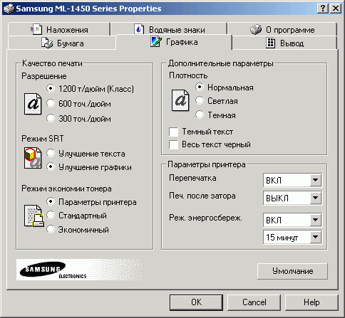 Закладка "Графика" (Graphics) позволяет настроить разрешение печати, задать программный режим экономии тонера, выбрать режим вывода графики (векторная / растровая) и метод вывода полутонов (задается устройством / точная / грубая / штриховая).