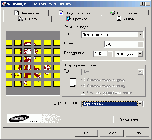 Закладка "Вывод" (Output) позволяет настроить вывод нескольких страниц на одну (2, 4, 9 или 16), распечатать документ с масштабированием (10% — 100%), уместить документ любого размера на странице заданной величины, распечатать плакат (размером от 1 × 1 до 6 × 6), обеспечить печать брошюры. Для некоторых пользователей будет интересен и режим "Ручного дуплекса" с переворотом по длинной или короткой стороне.
