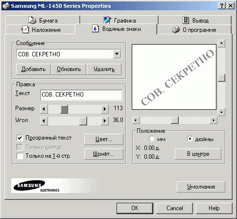 Закладка "Водяные знаки" (Watermarks) позволяет настроить принтер для печати заданных заранее фоновых текстовых "водяных знаков", при этом есть возможность выбрать размер шрифта, его прозрачность, наклон и положение надписи.