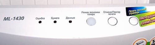 Вот таким образом выглядит передняя панель принтера — если можно так выразиться, достаточно привычно, на достаточно привычном месте. После включения принтера можно воспользоваться одной из кнопок и распечатать контрольную страницу. Ошибиться не получится даже у отчаянного "чайника": все пояснения на передней панели традиционно для принтеров от Samsung даны на русском языке.