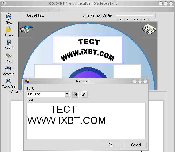 Нанесенные изображения и текст чрезвычайно устойчивы к внешним воздействиям — ни свет, ни вода им не вредят. Удалить надписи или рисунки, не повредив сам носитель, не получится. Стоит осторожно подходить к выбору болванок для использования в этом устройстве, они должны быть абсолютно «лысые». При печати матрица с нагревательными элементами должна плотно прижимать красящую ленту к поверхности диска. Даже малейший рельеф негативно сказывается на результате. Проявляется это в виде полностью пустых либо плохо пропечатанных областей. В общем, качество печати довольно посредственное, но иного результата мы и не ожидали. А вот максимальная упрощенность (я бы сказал убогость) программного обеспечения воистину поражает. Такое впечатление, что оно было сляпано на скорую руку и ждет дальнейшей доработки. И без того небогатые возможности принтера принудительно ограничиваются используемой программой.