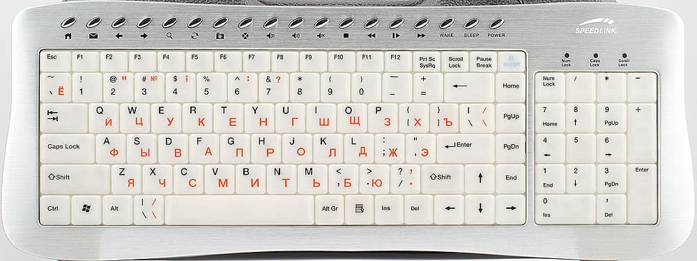 Сначала о хорошем. Цифровой блок не пострадал, над ним индикаторы Lock. Основной цифро-алфавитный тоже в целом правильный, по крайней мере слева и в центре. Сверху вплотную к нему расположился ряд F-клавиш, урезанных не только по высоте, но и по ширине — в нём дополнительно разместились PrintScreen, ScrollLock, Pause и кнопка включения подсветки. Слева от пробела зачем-то обосновалась дополнительная «слэшевая» клавиша. Правый край блока можно охарактеризовать словами «разброд и шатание». Положительный момент в том, что стрелка «вправо» находится с края блока, что позволяет хоть как-то вслепую позиционировать пальцы на неё. Отрицательный — что ни блок стрелок, ни Enter никак не выделены. Enter ещё и узкий и короткий, под ним короткий Shift. Правый край блока занимают клавиши пролистывания текста. А слева от соответствующей стрелки разместились Insert и Delete. Правый Control пал жертвой дизайнеров. В целом вслепую что-то делать в этой мешанине крайне сложно. Если же привыкнуть к такой раскладке, то найти её потом будет практически невозможно — эта вот чехарда на каждой модели лепится совершенно оригинальным образом, видимо, для того, чтобы сделать жизнь интереснее опрометчивому покупателю.