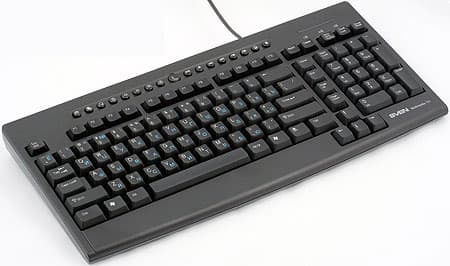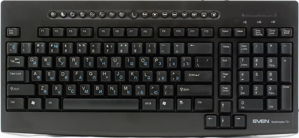 Если не считать компактных размеров, клавиатура подобна другим, более «классическим» моделям SVEN или других производителей. Она может иметь интерфейс PS/2, USB или комбо согласно информации на упаковке (на сайте указан только USB, но у нас на тестировании побывала «чистая» PS/2), так что подойдет для любого современного и не очень компьютера. Цвет — черный, символы латиницы нанесены белым цветом, кириллица — нежно-голубым (для черных моделей SVEN использует именно этот цвет, чем достаточно сильно отличается от конкурентов, отдающих предпочтение белому, красному или желтому цвету для кириллицы на черных клавиатурах), хорошо сочетающимся с синим цветом трех информационных светодиодов.