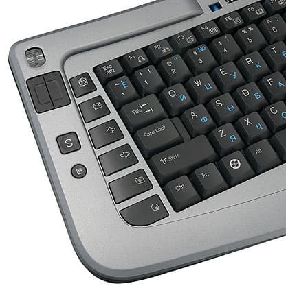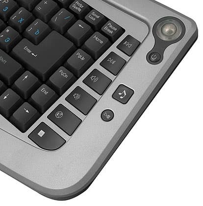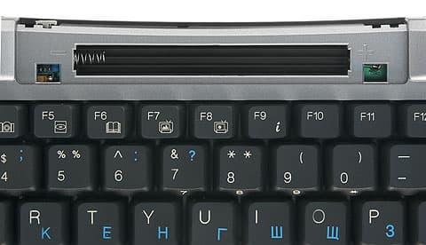 Работа с современными графическими операционными системами, даже при использовании специальных оболочек, крайне затруднительна без координатного указательного устройства. В качестве последнего на столе чаще всего используется мышь, в ноутбуках — тачпад, но применяются и другие варианты. В частности, в 9004 есть вполне полноценный оптический трекбол. Преимущество данного органа управления перед прочими (и, в частности, различными вариациями на тему джойстика в упомянутых в начале статьи клавиатурах BTC) — им можно легко пользоваться независимо от того, как мы держим клавиатуру. Если именно держим, то металлический шарик трекбола удобно вращать большим пальцем правой руки, а колесико прокрутки (равно как и нажимать помещенные под ним основные кнопки) — большим пальцем правой, удерживая клавиатуру за края. Если она лежит на столе или коленях, то «основными рабочими» пальцами становятся средний или указательный на левой и правой руках соответственно. Недостаток тоже лежит на поверхности — точность перемещения курсора прямо зависит от диаметра шарика, а тут он всего примерно сантиметр. Впрочем, НТРС для работы с Photoshop или динамичных 3D-игр все равно обычно не применяется, а если применяется, то для этих операций можно и обычную мышь подключить — современные ОС спокойно относятся к наличию нескольких координатных устройств. А вот для того, чтобы играть в спокойные игры или просто кликать по ссылкам, такой «мыши» вполне достаточно, как показала практика.