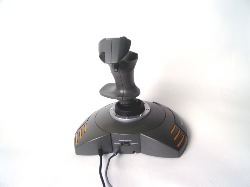 Управление перемещением по последней, четвертой, оси можно осуществлять двумя различными способами. На основании корпуса Thrustmaster Afterburner Force Feedback имеется двухпозиционный переключатель (Joystick/Throttle) определяющий каким элементом джойстика будет осуществляться управление Rudder’ом. В положении «Joystick», управление перемещением по четвертой оси осуществляется посредством поворота основной рукоятки джойстика вокруг вертикальной оси. В положении же «Throttle», Rudder управляется «качалкой», расположенной на рукоятке Throttle. Эти два различных способа управления четвертой осью введены для сохранения максимальной функциональности джойстика в его различных конфигурациях (об этом, так же, читайте ниже). Но, в обоих случаях, положение Rudder’а центрируется пружинами, предусмотренными конструкцией джойстика.