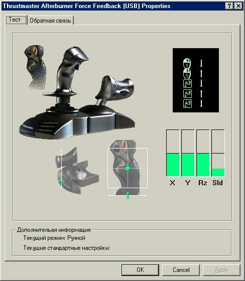 Тем же, кто все-таки хочет любой ценой использовать Thrustmaster Afterburner Force Feedback в системе под управлением ОС Windows XP и не желает дожидаться появления новых версий программного обеспечения, я могу дать одну единственную рекомендацию: Не устанавливайте пока в систему драйверы и прочее программное обеспечение, поставляемое производителем данного джойстика. При этом, ваш джойстик, обнаруженный системой как HOTAS Force Feedback Joystick, будет нормально функционировать, за исключением вибрационной обратной связи. Обидно, конечно, но этой функции вы лишитесь. Однако, на мой взгляд, вибрационная обратная связь — не единственное достоинство данного устройства, и если от его покупки вас удерживает только неработоспособность (думаю, временная) этой функции под ОС Windows XP, то в этом случае, как мне кажется, вы не правы. Даже без виброэффектов, Thrustmaster Afterburner Force Feedback является превосходным игровым манипулятором, что я и попытаюсь вам доказать дальнейшим описанием его функциональных возможностей.