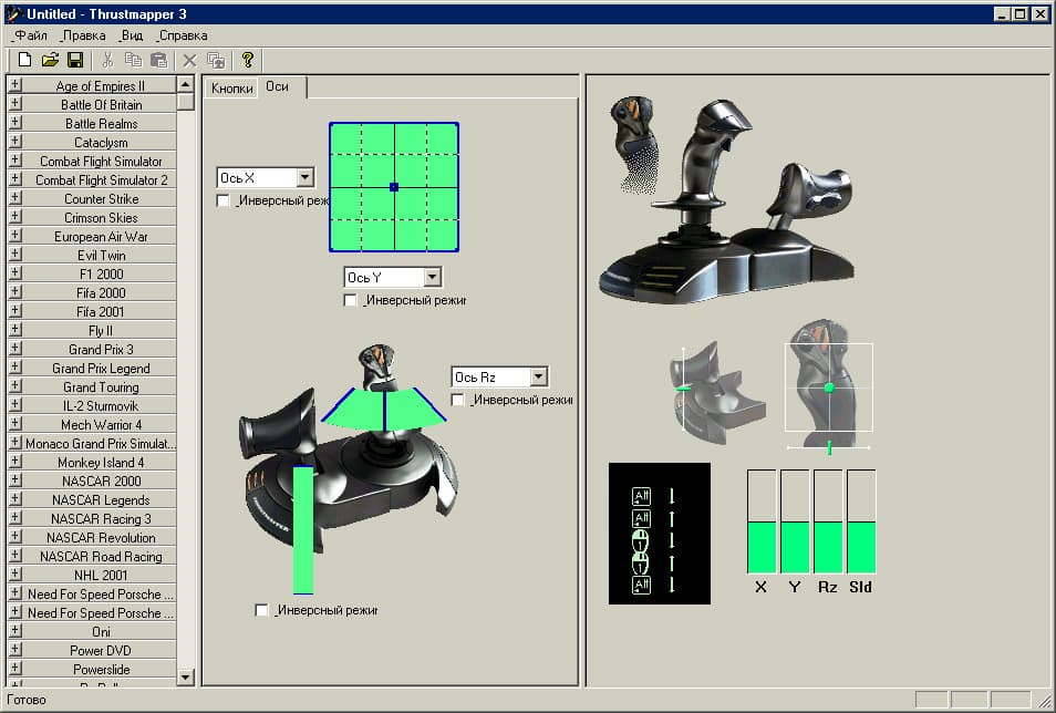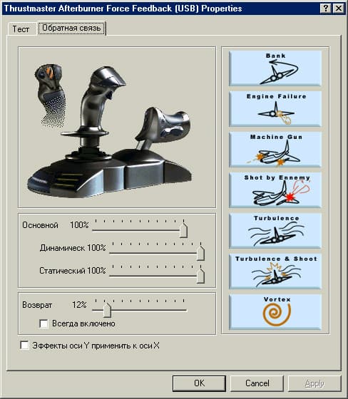 Если вы собираетесь использовать TopGun Afterburner Force Feedback в системе под управлением ОС Windows 98 или Windows ME, то никаких проблем с его программным обеспечением у вас не возникнет. Достаточно после подключения джойстика установить с прилагаемого компакт-диска, необходимый драйвер. Вместе с драйвером будет установлена программа Thrustmapper 3, предназначенная для конфигурирования джойстика под конкретные игровые программы и создания соответствующих профилей. После установки драйвера в списке игровых контроллеров (Control Panel — Gaming Options) появится устройство Thrustmaster Afterburner Force Feedback (USB). Открыв соответствующее окно свойств этого устройства, можно убедиться в работоспособности всех органов управления джойстика. Так, на закладке «Тест» проверяется управление перемещением по четырем осям и функциональные кнопки. На закладке «Обратная связь» вы можете корректировать параметры вибрационной обратной связи и тут же проверить их в действии. Для проверки вам достаточно кликнуть по одной из семи кнопок расположенных в правой половине окна и, в ответ на это нажатие, джойстик воспроизведет один из демонстрационных вибро-эффектов. Убедившись, что джойстик работоспособен, вы можете приступить к настройке профилей в программе Thrustmapper 3 или, минуя эту процедуру, — непосредственно к играм. В любом случае, еще раз отмечу, никаких трудностей или проблем с программным обеспечением и функционированием Thrustmaster Afterburner Force Feedback под управлением ОС Windows 98 и Windows ME возникнуть не должно. Совсем по другому дела обстоят с операционной системой Windows XP …