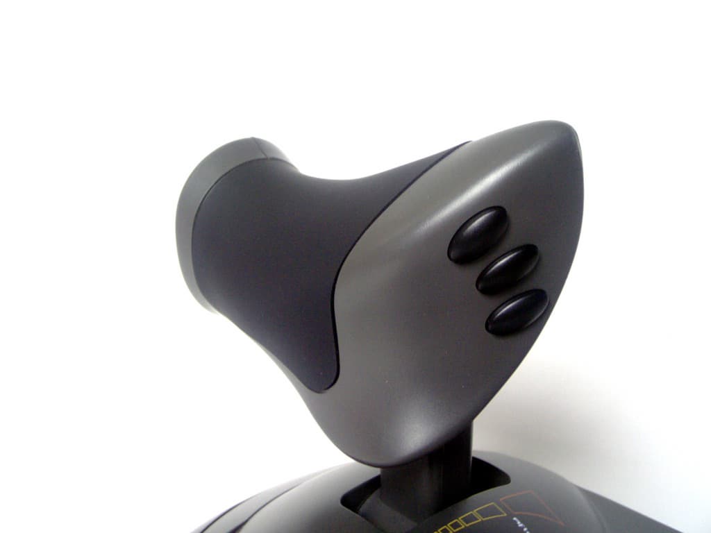 Конструкция TopGun Afterburner весьма примечательна и заслуживает некоторого описания. Для начала следует заметить, что джойстик очень прочен, что, несомненно, важно. Даже в пылу игрового азарта вам вряд ли удастся его сломать. Весь его корпус выполнен из пластика серого и черного цветов. Исключение составляют металлическая окантовка вокруг основания правой рукоятки и резиновый брюканец на ней же.