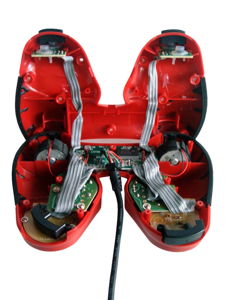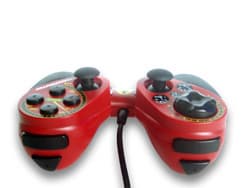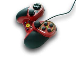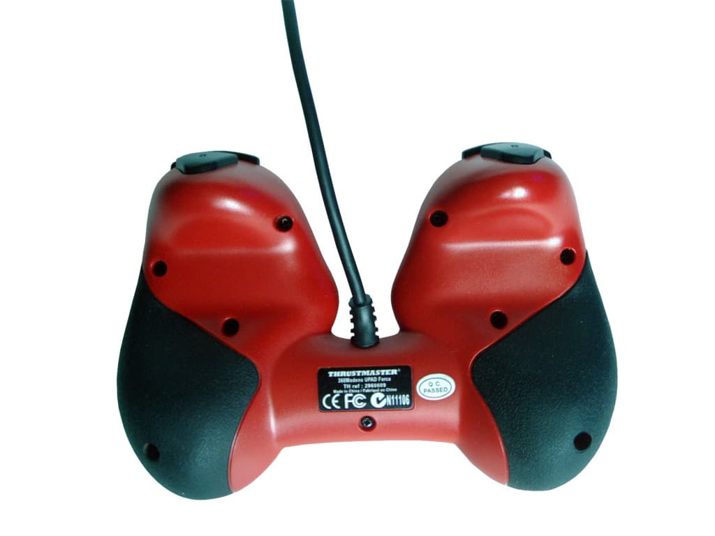 В отличие от большинства современных геймпадов, имеющих форму «бумеранга», корпус Thrustmaster 360modena Upad Force не совсем обычен. С виду он состоит как бы из двух отдельных корпусов, соединенных тонким перешейком. Несмотря на незначительную толщину этого перешейка, опасаться за его целостность во время интенсивной игры не следует. Слегка шероховатый, красного цвета пластик, из которого выполнен корпус Thrustmaster 360modena Upad Force, достаточно прочный и не боится больших нагрузок. Черные вставки, которые хорошо видны на приведенных фотографиях, в первую очередь вовсе не элемент декорации. Выполненные из шероховатой нескользкой резины они создают лучший контакт руки пользователя с корпусом геймпада, тем самым облегчая удержание последнего. Почти все органы управления Thrustmaster 360modena Upad Force расположены традиционно для этого типа игровых манипуляторов. Четыре функциональных кнопки-курка установлены на передней, торцевой части его корпуса. Еще четыре — на правой части корпуса, и еще две на перешейке, между корпусами. Итого, насчитывается десять программируемых функциональных кнопок. Где же еще две? А они как бы скрыты, и в явном виде, на корпусе геймпада, вы их не обнаружите. Две оставшихся функциональных кнопки совмещены с аналоговыми мини-джойстиками. Что бы воспользоваться ими, надо всего лишь нажать на один из мини-джойстиков. При этом функции самого мини-джойстика не изменяются.