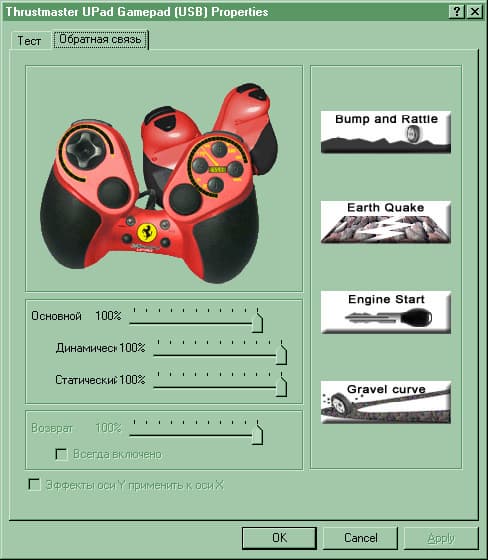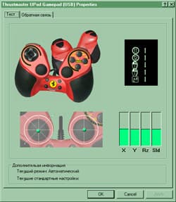 В соответствующих закладках, в свойствах игрового манипулятора (Control Panel/Game Controllers …), где Thrustmaster 360modena Upad Force изображен очень наглядно, доступна проверка аналоговой части, D-Pad’a, функциональных кнопок и эффектов вибрационной обратной связи. Если все его органы исправно функционируют, то, соответственно, можно смело приступать к играм. Тем же, кто еще не приобрел Thrustmaster 360modena Upad Force и не может насладиться игрой с ним, я могу предложить описание того, что же являет собой этот игровой манипулятор.
