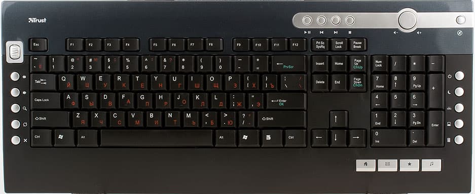 С правой стороны, сверху вниз: Отключение/Включение ПК, Сон, Пробуждение, Мой компьютер и Калькулятор. Такая группировка нам не понравилась, всё кнопки управления питанием лучше чётко отделить от всех прочих и вынести куда-нибудь, где на них сложнее нажать случайно. Под цифровым блоком слева направо: Домашняя страница, Почта, Избранное и Моя музыка. Расположение этих четырёх кнопок также не очень удобно, могут быть случайные нажатия. Итого, имеется 19 дополнительных кнопок и два колеса.