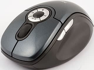Мышь из радионабора отличается немного от сестры по форме, но незначительно. Боковины из слегка шершавого пластика, а вся верхняя поверхность глянцевая, тёмно-серая. Для главных кнопок такой материал не очень хорошо подходит — он липнет к пальцам. Боковые кнопки отделены друг от друга, и за колесом размещены ещё четыре дополнительных, для управления воспроизведением медийных файлов, транспортная панель. Стоп, переход на трек вперёд и назад, и пауза/воспроизведение. Между ними — неактивная площадка. Она оказалась очень удобной — именно в то место упирался сустав среднего пальца. Для использования кнопок его приходится сгибать, но нажимать их удобно и ложных срабатываний не было — кнопки достаточно тугие. На брюшке, кроме сенсора (на этот раз с видимой подсветкой красного цвета) находятся: батарейный отсек, кнопка Connect и пять маленьких ножек чёрного тефлона. Поведение сенсора явно указывает на режим энергосбережения, отлично нам знакомый по A4 Tech RP-680. Ложные срабатывания у колеса проявлялись чаще, чем у проводного варианта.