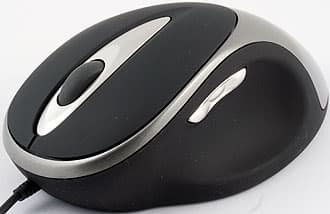Основное отличительное свойство мыши — это её форма. Она уходит глубоко в историю, к первой MS IME и Logitech MouseMan. Тогда делали такие эргономичные под правую руку, большие и простые изделия. Потом эта мода прошла, и сейчас под большую руку мышей не так много. Итак, мышь большая, с явно приподнятой спинкой, под большой палец рассчитано углубление на левом боку. Над ним — две дополнительные кнопки, сделанные в виде качалки. Боковые поверхности и основные кнопки из чёрного «резинистого» пластика, а спинка глянцевая, серебристо-серая. Впрочем, контакт ладони с ней не очень плотный, и к руке она не липнет. Между основных кнопок — вставка из серебристого пластика, в ней колёсико, резиновое, без насечек и без горизонтального скролла, с кнопкой под ним. Получается классический IntelliMouse, четыре кнопки и колесо. Все кнопки звонкие, нажатие лёгкое и информативное. Колёсико также неплохое, но изредка случаются ложные срабатывания.