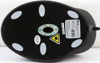 На брюшке в центре (он же центр тяжести, мышь хорошо сбалансирована) находится окошко сенсора. По сторонам — целых шесть достаточно больших ножек из белого тефлона. И ещё там наклейка с выходными данными. Завершает композицию кабель длиной около двух метров, мягкий и тонкий, крепление с небольшим демпфером.