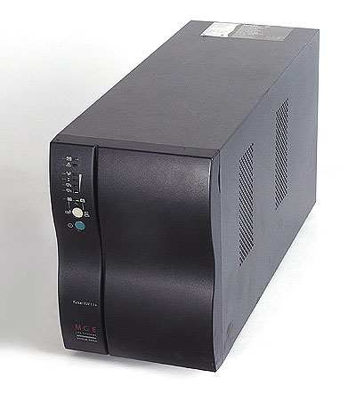 Внушительный металлический корпус сочетается в этой модели с минимальными возможностями индикации и управления. По имеющимся на передней панели четырем светодиодам оценивается режим работы прибора — от сети либо от батареи, определяется возникновение перегрузки или внештатной ситуации. Связь с компьютером осуществляется посредством разъема RS-232, расположенного на задней стороне корпуса. Имеются четыре выхода на нагрузку, гнездо для подключения ЛВС, а также набор из двух DIP-переключателей, позволяющих устанавливать параметры входного и выходного напряжений. Комплектность устройства стандартная — два кабеля для нагрузки, руководство пользователя на русском языке, интерфейсный кабель и компакт-диск с Powerware Software Suite.