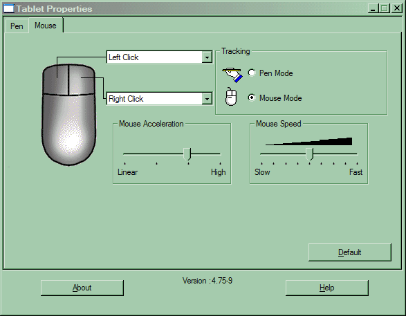 Для мыши же можно настроить функции обеих кнопок, скорость перемещения курсора и акселерацию. Замечу еще, что ничто не мешает включить абсолютную адресацию для мыши или относительную для пера. Ничто, кроме здравого смысла :)