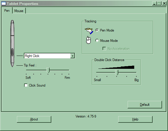 Как и несколько лет назад, драйвер для планшетов работает на положении обычной загружаемой программы, однако переход к USB и эмуляция планшетом USB-мыши, вкупе с современными версиями Windows, позволили полностью забыть о старых недостатках данного способа, так что большинство пользователей разницы просто не почувствуют. После установки ПО появляется режим абсолютной адресации, да и настроить некоторые параметры устройства можно, причем раздельно для пера и для мыши. Вот, к примеру, что доступно для пера: