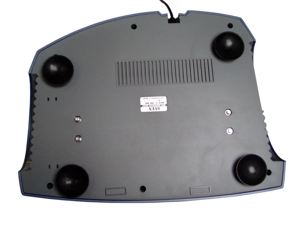 Установка педалей, как вы, наверное, догадываетесь, ничем не отличается от установки педалей любого другого игрового манипулятора такого типа. Тут, собственно, и устанавливать то нечего. Просто кладем их на пол. И все же, педали педалям рознь. Разработчики не стоят на месте и выдумывают различные приспособления, вроде “гребенок”, подобно рулю Logitech MOMO, которые призваны сделать нашу с вами пользовательскую жизнь более комфортной. Только вот, к рассматриваемому сегодня манипулятору это не относится. Его педали опираются на четыре совсем небольших, круглой формы, резиновых ножки. Точно на таких же ножках устанавливались педали Rockfire QF-368UV. Но, смотря на приведенные фотографии, можно заметить, что конструкция основания корпуса QF-2000IF несколько иная. Он намного меньше, чем у всех рулей рассмотренных мною в предыдущих частях “Эффектного колеса” и занимаемая им площадь составляет всего 33х22.2см. Площадка, обычно расположенная под ногами пользователя отсутствует. В данном случае, это оказывается только на пользу, так как вся конструкция педалей, в общем, получилась весьма устойчивой. Передний край основания корпуса практически никогда не отрывается от пола и соответственно не создает пользователю никакого дискомфорта. Правда, достигается это не только за счет размеров основания.