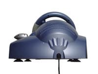 Как можно заметить, смотря на фотографии, большая часть элементов управления Rockfire QF-2000IF расположена на лицевой стороне рулевого колеса, диаметр которого равен 25.3см. В центре, под декоративной пластиковой вставкой, находятся два светодиодных индикатора, индицирующих наличие питающего напряжения и включение режима вибрационной обратной связи. Справа, слева, и снизу от центра размещены шесть функциональных кнопок. Еще две, те, что дублируют собой рычаг переключения скоростей, располагаются слева вверху от центра. Справа вверху установлен восьмипозиционный переключатель видов (POV). Все кнопки и переключатель расположены очень удачно и хорошо доступны. Думаю, что никаких нареканий на них ни у кого возникнуть не может. Итого, помимо переключателя видов, на лицевой стороне рулевого колеса расположены восемь программируемых функциональных кнопок. Но, как я уже писал, Rockfire QF-2000IF оснащен двенадцатью такими кнопками. Где же оставшиеся четыре? Искать их нужно с тыльной стороны рулевого колеса, там, где обычно расположены “крылышки”. Сгруппированные по две, кнопки располагаются симметрично, относительно оси колеса. Чтобы пользователь мог пользоваться ими на ощупь и при этом не перепутать, на верхних кнопках отлиты пупырышки. Конечно, любителям “крылышек” эти кнопки не смогут стать их полноценной заменой, но остальным пользователям, я думаю, они придутся по вкусу. Так же по вкусу придется и резиновое покрытие. Хоть оно и не полностью покрывает колесо, но даже того, что есть, вполне хватает, чтобы обеспечить должный комфорт во время игр. Резина не скользкая и шероховатая, так что скольжения рук по колесу не будет. Еще одним положительным качеством Rockfire QF-2000IF является угол поворота колеса. Он оказался точно таким же, как и у ранее описанного в “Эффектном колесе” манипулятора Logitech MOMO и составил 230 градусов (±115 градусов).