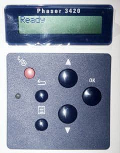 ЖК панель контроля режимов принтера Xerox Phaser 3420 имеет достаточно привычный для моделей этого класса 2-строчный дизайн. Манипулируя кнопками управления, можно изменить большинство настроек принтера без обращения к настройкам драйвера печати, плюс, вывести на печать контрольную страницу и текущие установки модели.