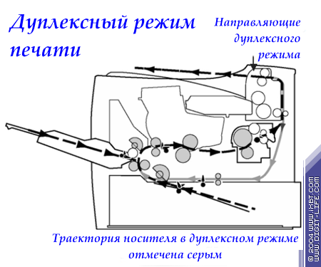 Принцип работы принтера Xerox Phaser 3420 в дуплексном режиме, являющемся стандартной функцией для этой модели, показан на схеме ниже; визуально скорость работы принтера при установках двусторонней печати происходит достаточно высока. Модель достаточно энергично запечатывает обратную сторону листа, отдельно стоит отметить, что в настройках принтера возможна установка «переворачивания» листа как по широкой, так и по узкой стороне.
