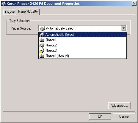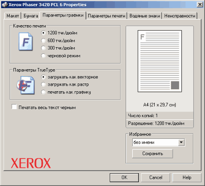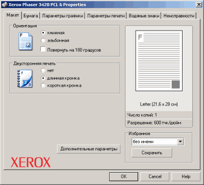 Наиболее наглядными можно назвать настройки принтера Xerox Phaser 3420 при работе с драйвером PCL6. Достаточно привычный для такого класса принтеров набор закладок драйвера позволяет настроить все, необходимое для печати, включая установки носителя, режимы дуплекса и качества.