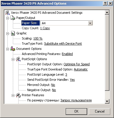 Установки PostScript выглядят значительно проще, однако, с помощью закладки «Расширенные настройки» есть возможность установить любые параметры, необходимые для полноценного использования этого драйвера.