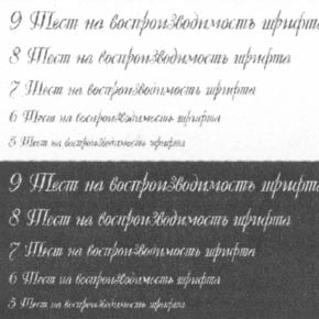 Далее, внимательнее присмотревшись к отпечатку, замечаем особенности передачи полутонов: в светах растрирование носит стохастический характер, однако чем насыщенней оттенок, тем больше проявляется регулярная сетка. Внутренние алгоритмы обработки данных не видят особой разницы между векторными, растровыми и текстовыми данными. Растрируется все подряд, черный цвет всегда составной и больше других от этого страдает, конечно, мелкий текст, которому просто суждено состоять из скопищ разноцветных пятен. Даже включив монохромный режим печати и избавившись от цветастого калейдоскопа, особой четкости текста мы не получаем. Буквы хотя и читаемы, но весьма расплывчаты. Показателен в данном случае тест на воспроизведение декоративного шрифта — шансов прочитать текст мельче, чем 8 пунктов, очень мало.