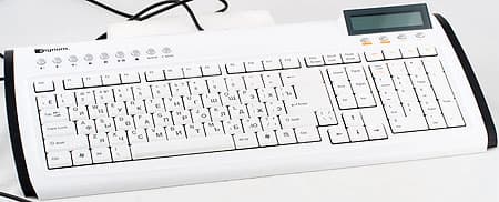 Главная же «фишка» притаилась справа в верхнем углу — прямоугольный жидкокристаллический дисплей выдает встроенный в клавиатуру и совмещенный с дополнительным цифровым блоком самый обычный калькулятор на 12 разрядов. Плоскость дисплея наклонена под углом примерно 30 градусов к корпусу, образуя треугольный бугорок. Также этот дисплей выполняет функции индикаторов состояния клавиш NumLock, CupsLock и ScrollLock. Подробней мы остановимся на нем чуть ниже.