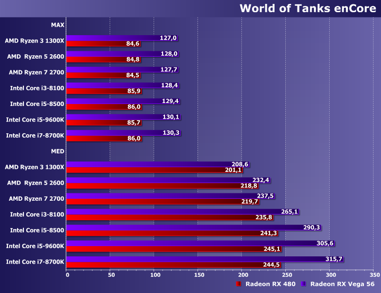 Хотя, повторим, на практике этому можно не придавать значения: различия между процессорами начинают проявляться лишь при «зашкаливающей» частоте кадров (200+ FPS), но для получения таких результатов «на средних» все равно требуется видеокарта, отлично справляющаяся и с «максимальными». А вот в последнем случае все равны как на подбор.