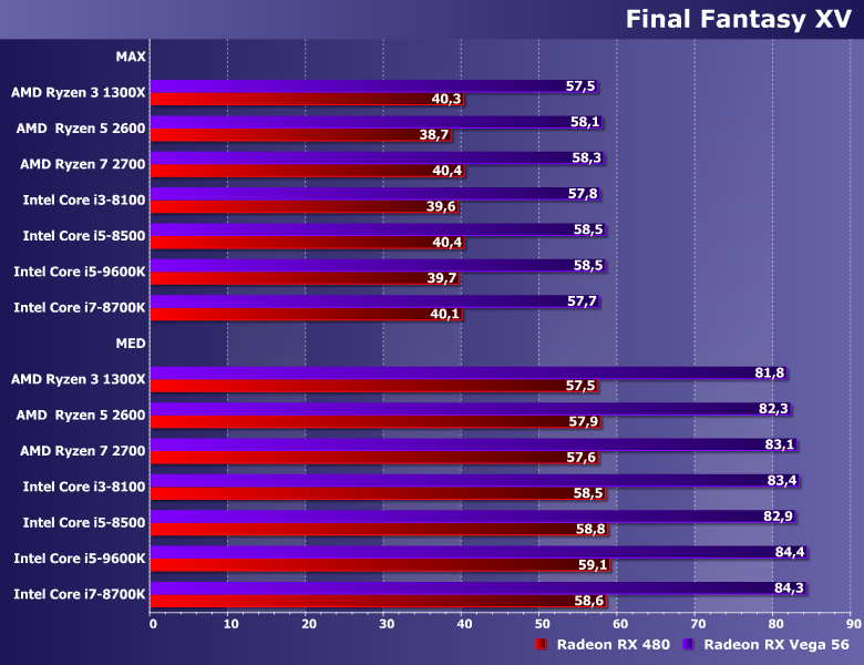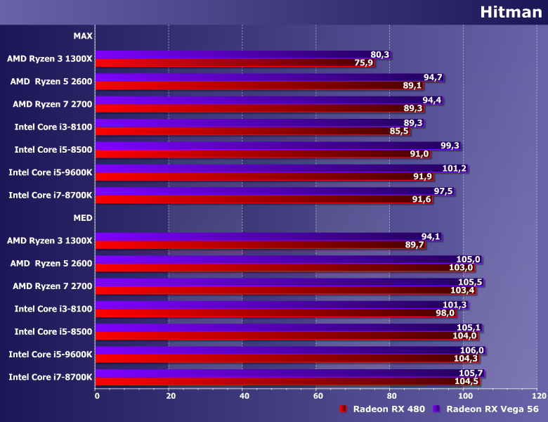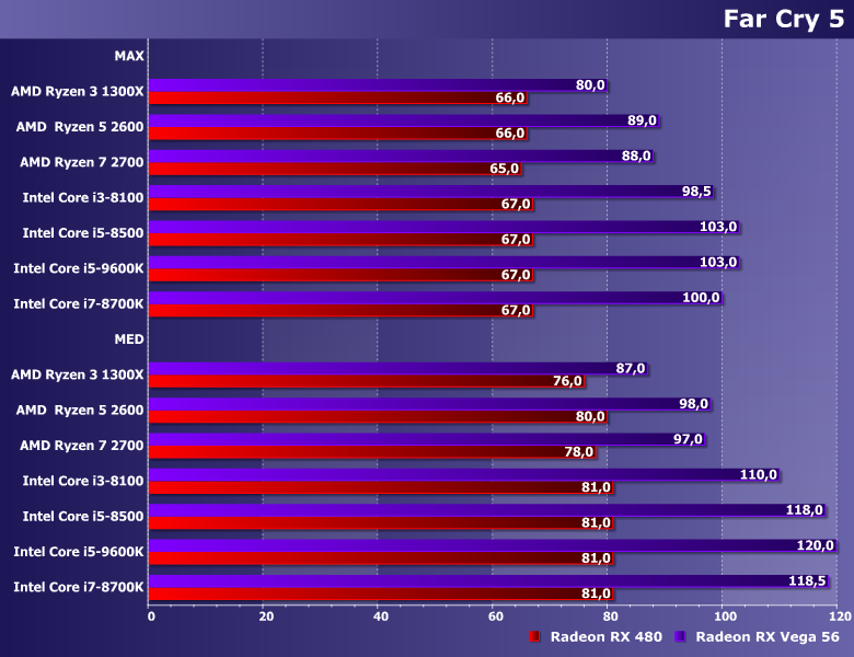 Все процессоры мы укомплектовали 16 ГБ памяти типа DDR4, работающей на «официальной» (для каждого процессора) тактовой частоте. Все работали, соответственно, на системной плате Asus TUF X470-Plus Gaming или Asus ROG Maximus X Hero с одним и тем же кулером, SSD и т. п. И видеокарты тоже использовались одни и те же, но их мы взяли две. Во-первых, Radeon RX 480 двухлетней давности — уже тогда решение среднего класса, позднее немного обновленное до RX 580, а недавно и до RX 590. Впрочем, обновления не радикальные, так что все это семейство ускорителей ориентировано на работу (в первую очередь) с разрешениями уровня Full HD, и именно такое мы сегодня будем использовать. А чтобы оценить т. с. перспективность, мы взяли еще и (во-вторых) Radeon RX Vega 56. Формально такие ускорители уже в большей степени позиционируются под 2К/4К, так что в FHD имеют запас производительности — но именно в таких-то случаях и можно сравнивать процессоры: в предельных от них уже ничего не зависит.