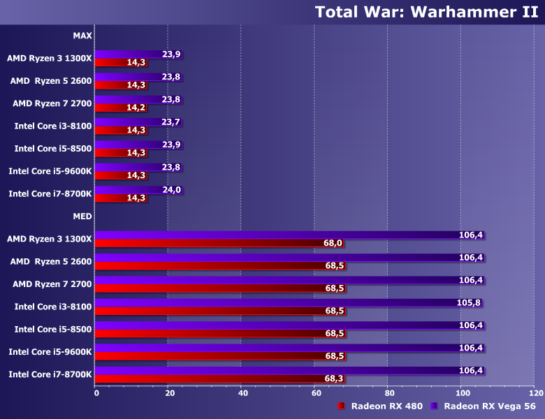 В режиме максимального качества производительность целиком и полностью определяется видеокартой, причем даже RX 480 достаточно для того, чтобы получить более 80 FPS на любой системе (как мы уже убедились ранее, для этого достаточно даже Athlon или Pentium Gold). Естественно, в таких условиях «средние» становятся не слишком интересными с практической точки зрения... с теоретической же можно отметить очень хорошую масштабируемость нового движка по ядрам и потокам: при прочих равных чем их больше, тем выше производительность. А вот при неравных — весомее эти самые «неравные»: i7-8700K, конечно, быстрее, чем i3-8100, но ведь и последний уже обгоняет все протестированные нами Ryzen!