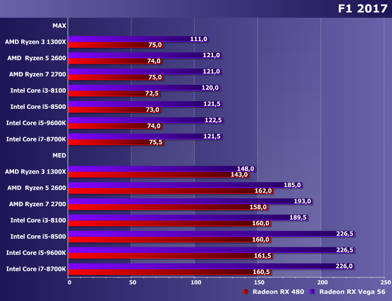 Еще один случай, когда шесть ядер явно лучше, чем четыре таких же, причем количество может и перейти в качество — тут уже Core i3-8100 от Ryzen 5 2600 немного, но отстает. Но в целом ряды испытуемых очень плотные, да и все результаты сегодняшних конфигураций только начинаются с 75 кадров в секунду. С практической точки зрения — уже нормально. Тем более, что существенно быстрее «сделать» очень сложно и достаточно дорого.