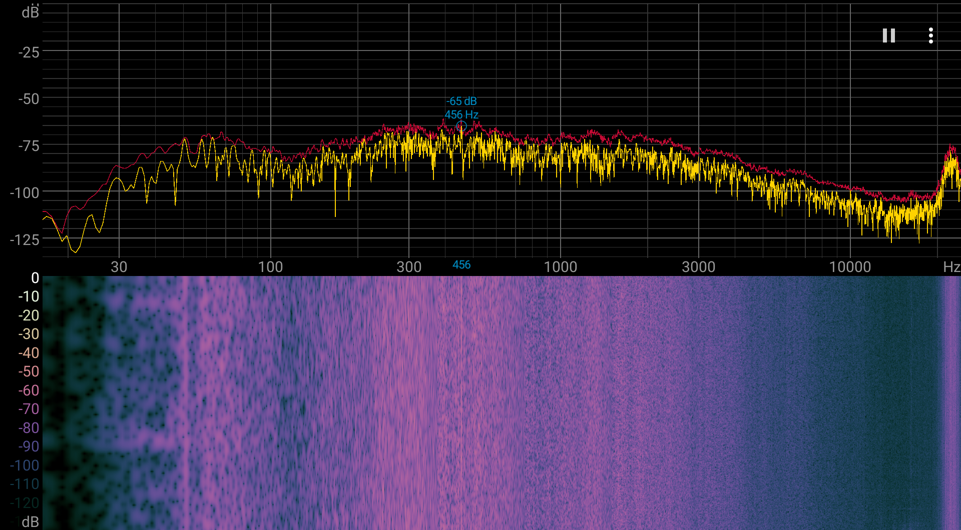 Даже под максимальной нагрузкой характер шума более-менее ровный и раздражения не вызывает. Спектрограмма, полученная при максимальной нагрузке, в основном ровная, и в диапазоне частот, где звуки могут вызывать особенное раздражение, выраженных пиков нет (низкочастотными пиками можно пренебречь):