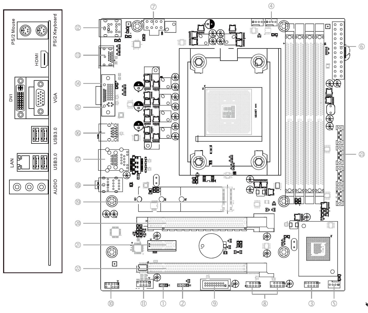 | Разъемы на задней панели | 4 × USB 3.2 Gen2 (Type-A) 3 аудиоразъема типа миниджек 1 × RJ-45 1 × d-Sub (VGA) (выход) 1 × HDMI (выход) 1 × DVI-D (выход) 2 разъемa PS/2 |