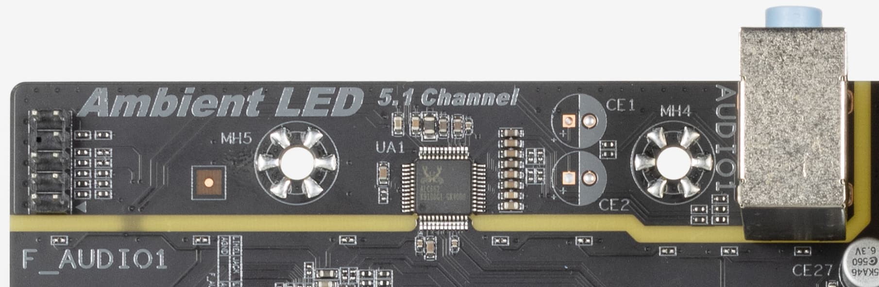 Аудиотракт вынесен на угловую часть платы, не пересекается с другими элементами. Все аудиоразъемы на задней панели имеют привычную цветовую окраску.