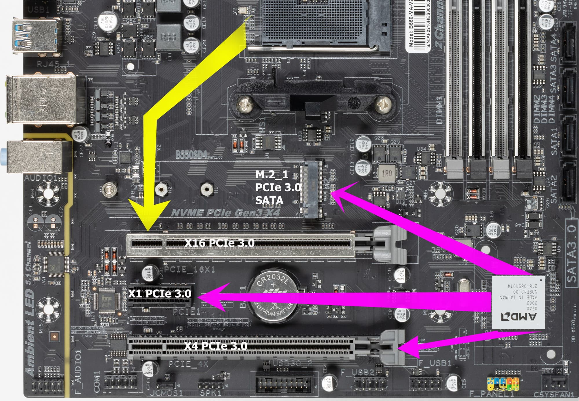 Итак, кроме USB-портов, к которым мы подойдем позже, чипсет B550 обладает 14 PCIe линиями (плюс 4 линии на аплинк с процессором). Считаем, сколько линий уходит на поддержку (связь) с тем или иным элементом:
