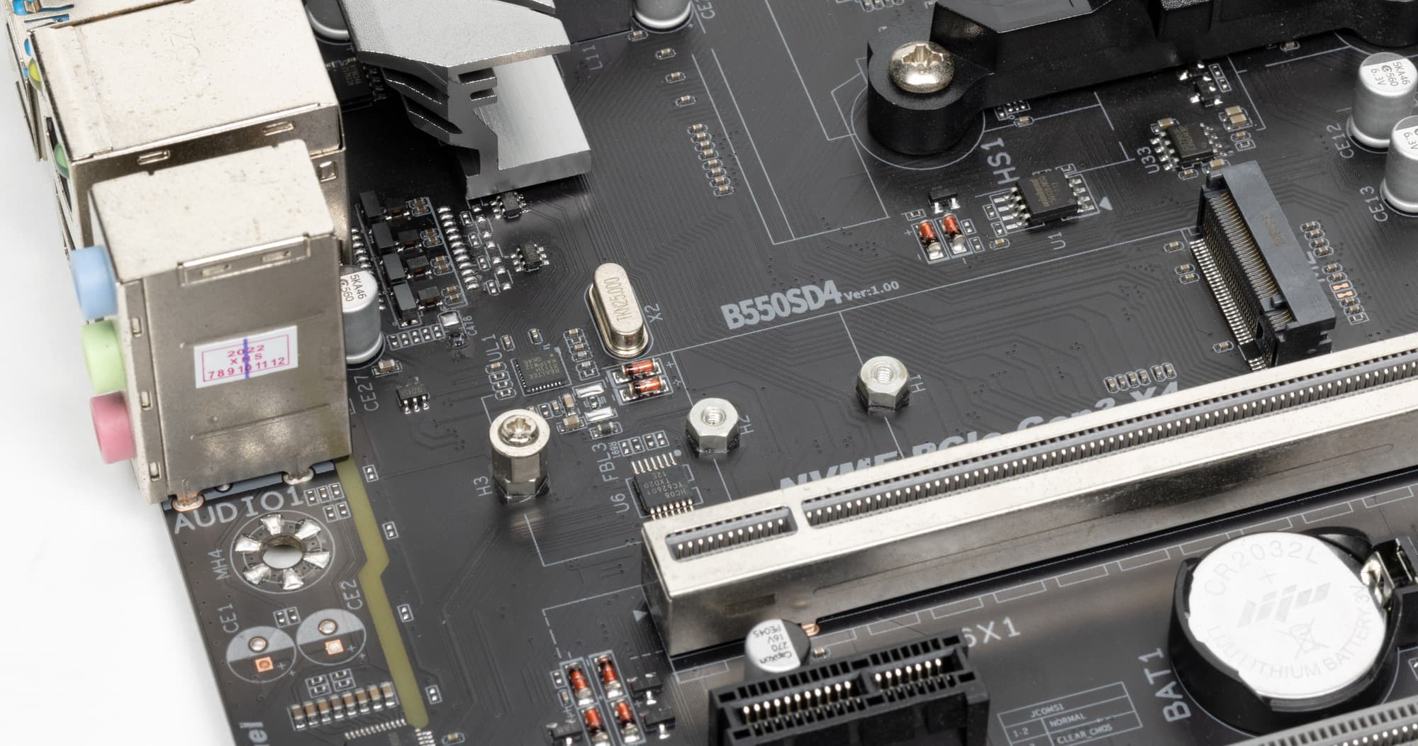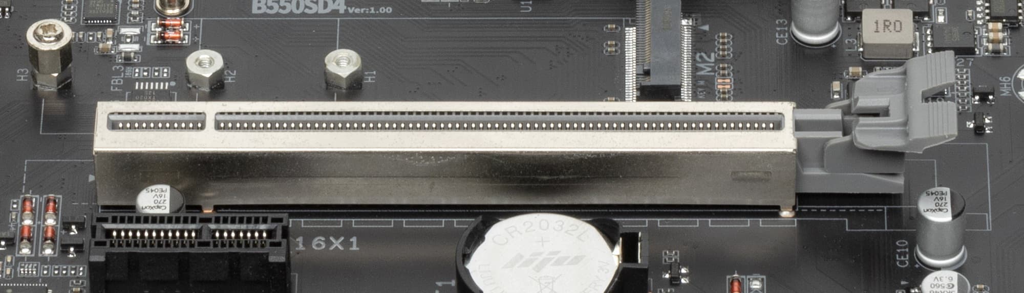 Всего на плате есть 3 слота PCIe: два PCIe x16 (для видеокарт или других устройств) и один «короткий» PCIe x1 (второй по счету). Если про первый PCIe x16 я выше уже рассказал (он подключен к CPU и используется для видеокарт), то второй PCIe x16_2 (третий по счету) подключен к B550 и максимально работает в режиме х4. Слот PCIe x1 подключен также к B550.