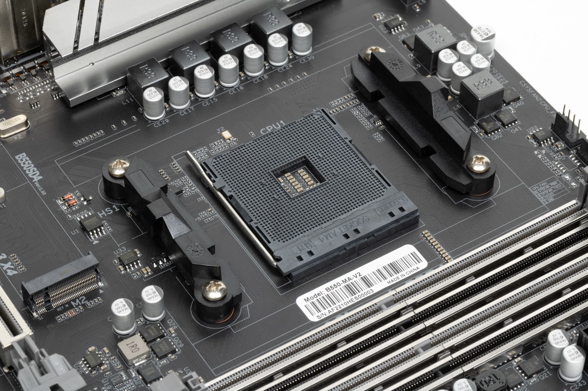 Теперь про охлаждение. Оно простое: радиаторы имеют только чипсет B550 и часть VRM, отвечающая за VCore.