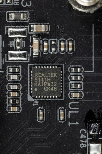 Материнская плата оснащена средствами очень скромно. Имеется Ethernet-контроллер Realtek RTL8111G, способный работать по стандарту 1,0 Гбит/с.