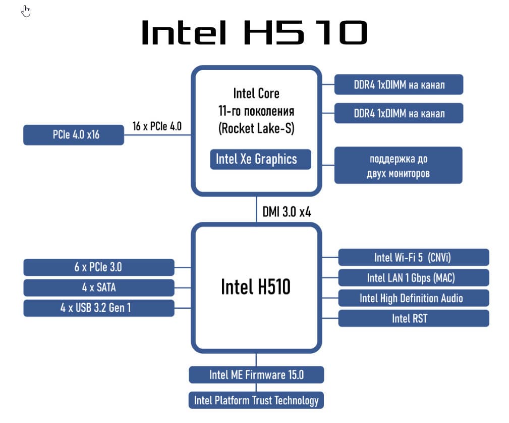Процессоры Intel Core 10-го и 11-го поколений (совместимые с сокетом LGA1200 и поддерживаемые H510) не имеют USB и SATA портов, при этом процессоры 11ххх имеют 20 линий ввода-вывода PCIe 4.0, а 10ххх – 16 линий PCIe 3.0. Взаимодействие с H510 идет по особому каналу Digital Media Interface 3.0 (DMI 3.0). Все PCIe линии процессора идут на слот расширения PCIe и порт М.2 (только к 11го поколения). Serial Peripheral Interface (SPI) используется для взаимодействия с системой UEFI/BIOS и для связи с устройствами ввода/вывода, не требующими высокой пропускной способности (контроллерами вентиляторов, TPM, старой периферии). Аудиокодек поддерживается особым каналом HDA.