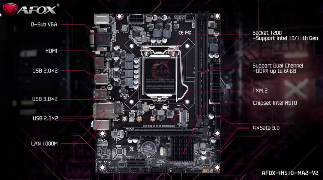 Afox IH510-MA2-V2 — отличный вариант очень дешевой материнской платы для системного блока небольших размеров с поддержкой процессоров Intel Core 10-го и 11-го поколений.