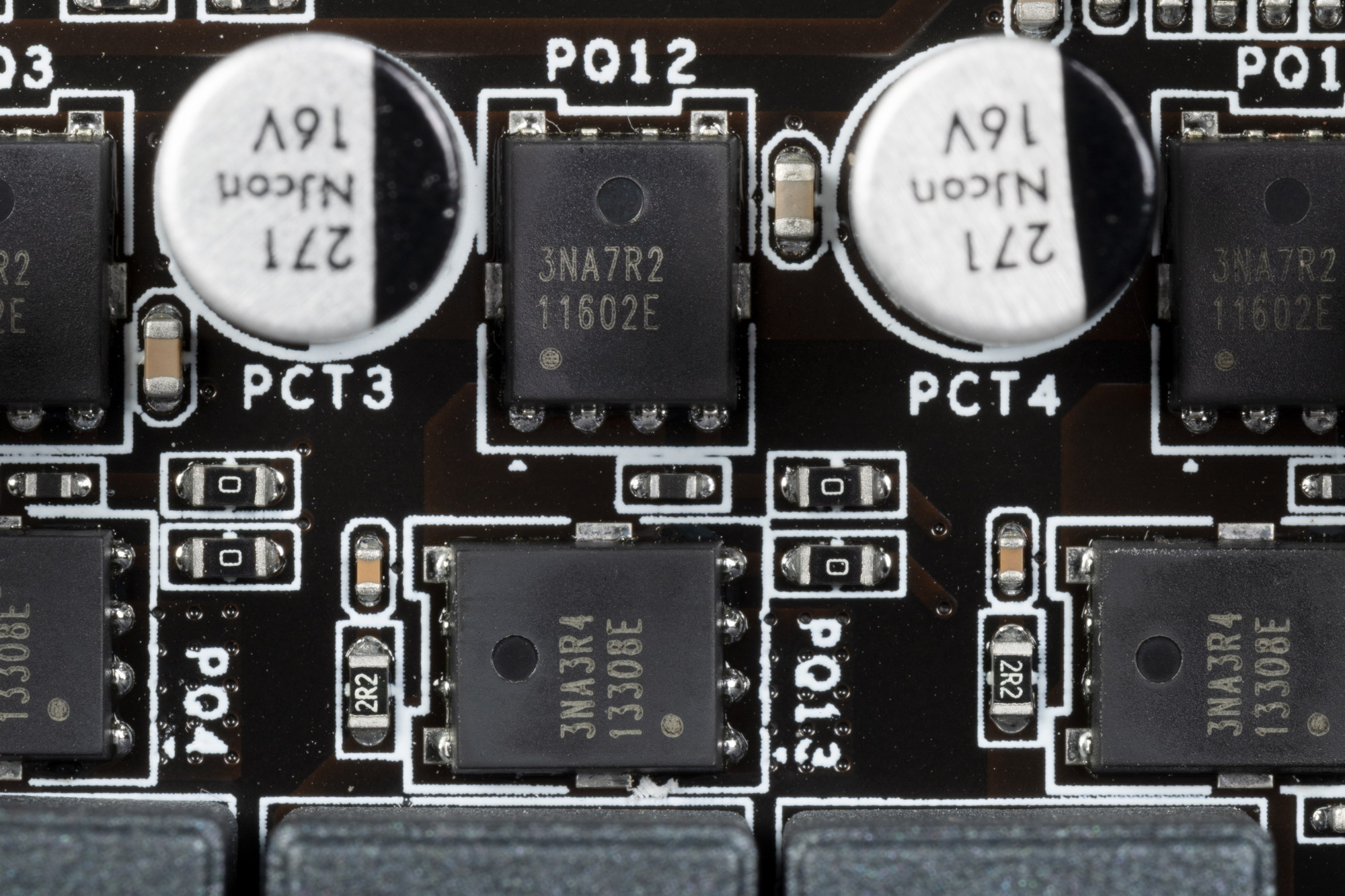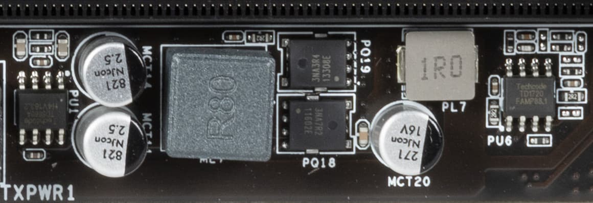 Каждый канал фазы имеет суперферритовый дроссель и набор полевых транзисторов RMN3NA7R2/3NA3R4 от Rectron Semiconductor (до 52А).