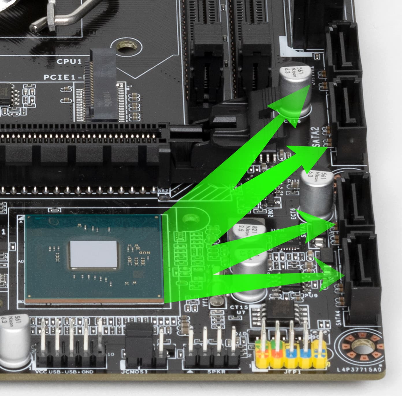 Теперь про охлаждение. Оно банальное. Только один чипсет H510 имеет радиатор.