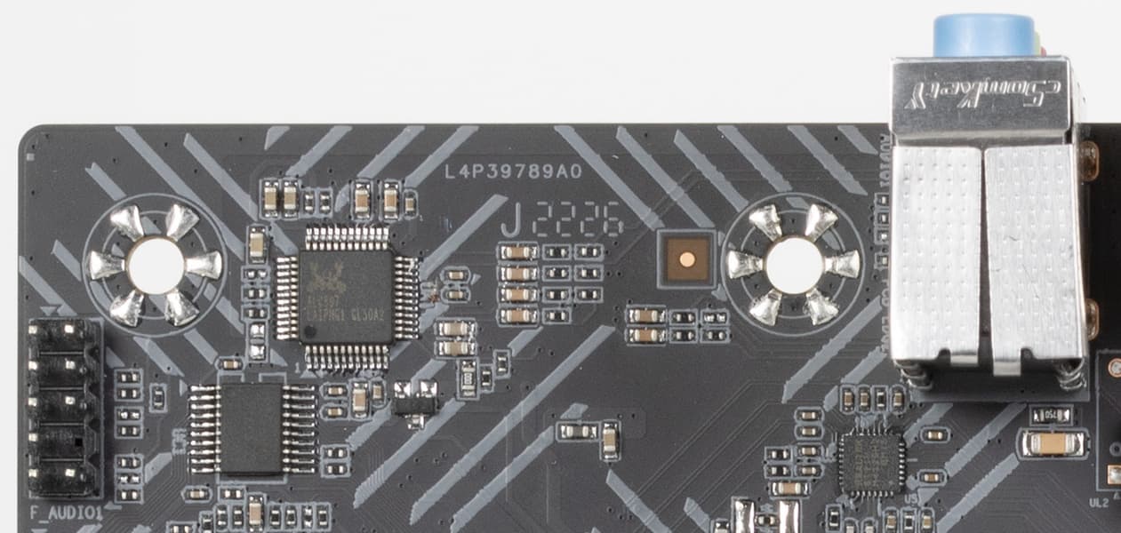 Аудиотракт вынесен на угловую часть платы, не пересекается с другими элементами. Все аудиоразъемы на задней панели имеют привычную цветовую окраску. S/PDIF нет.